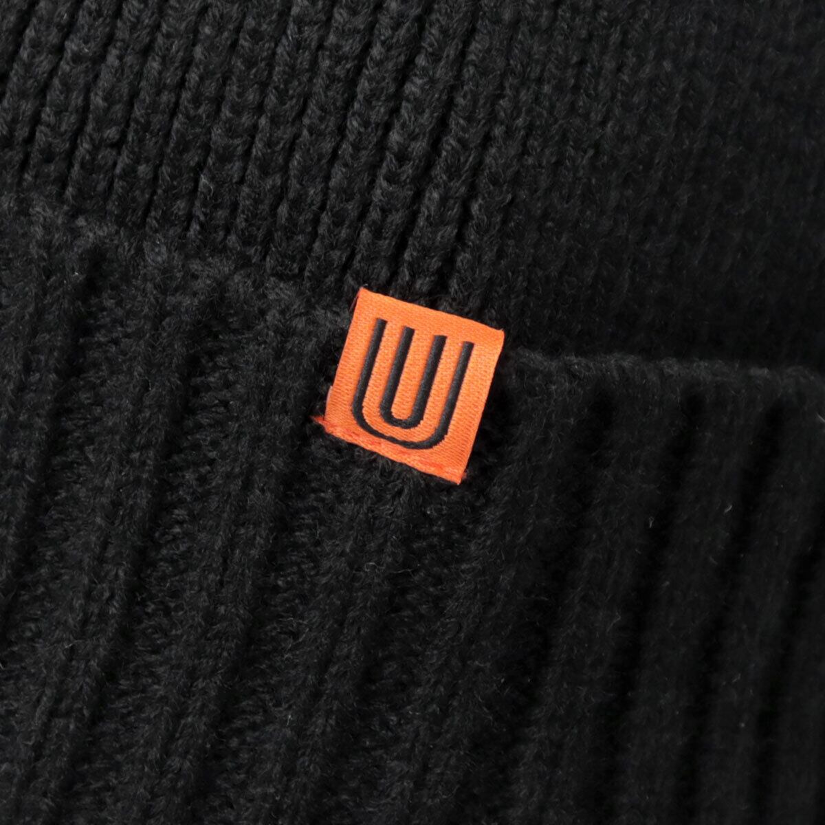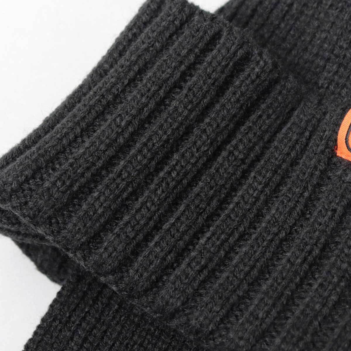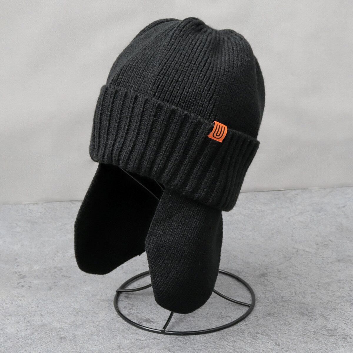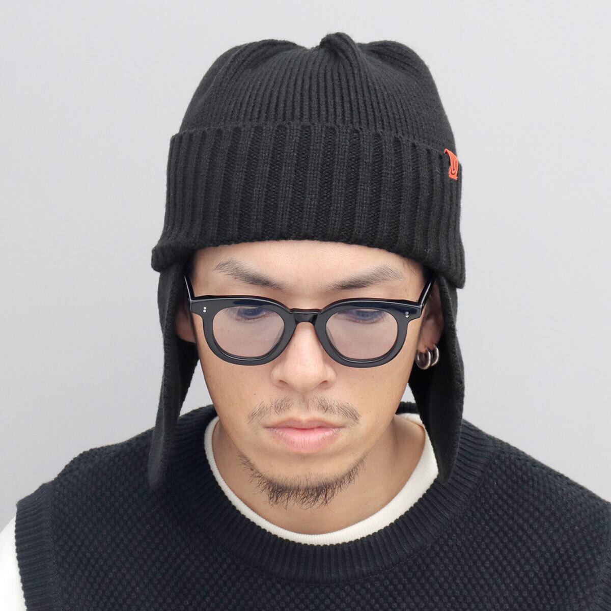 見た目も暖かな耳当て付きのニットキャップ。フロントのサイドに配置した、オレンジのアイコンタグがさり気ないアクセントに。