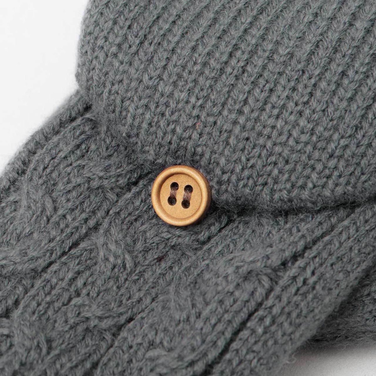 親指部分は、常に指が出ているフィンガーレス仕様。人差し指、中指、薬指、小指はミトン部分をボタンで留めることで、4本指が出せる仕様。手袋を脱がなくてもスマホや細かい作業が可能。