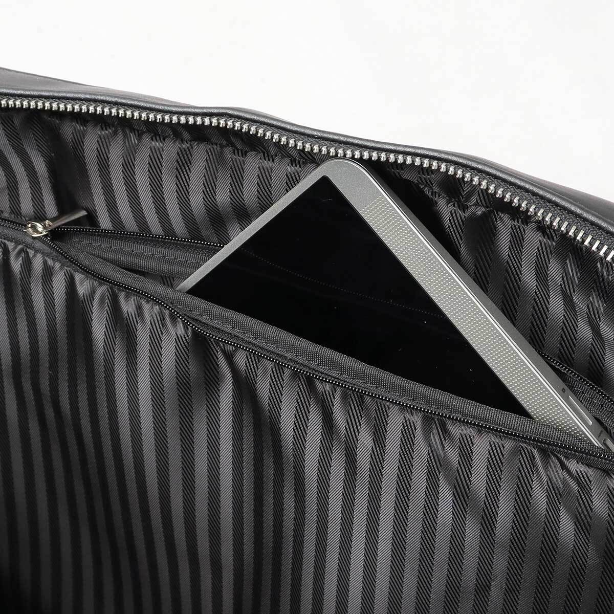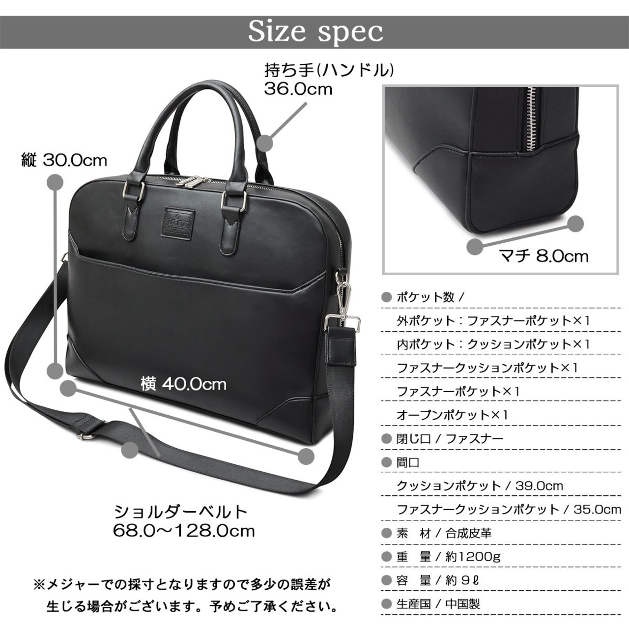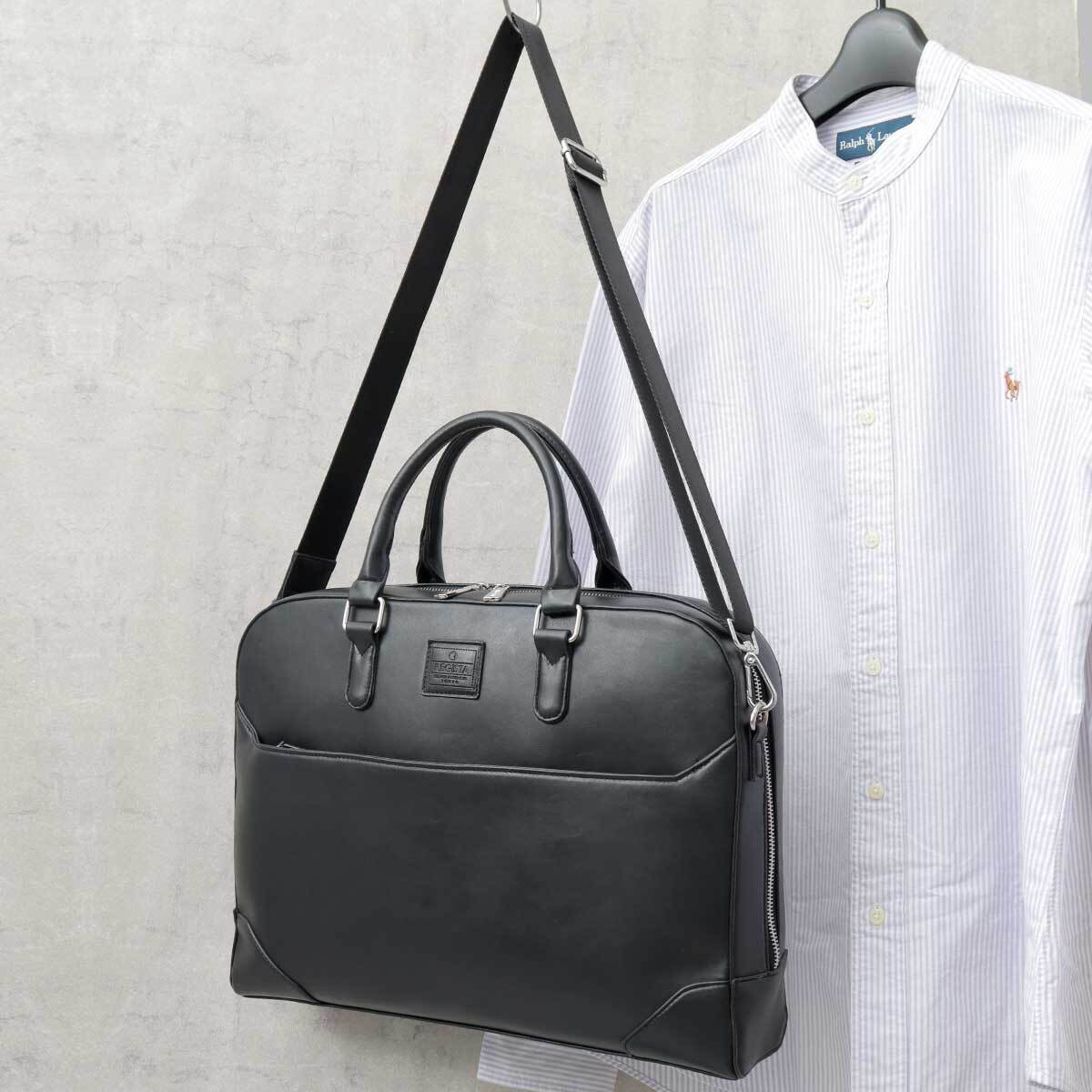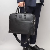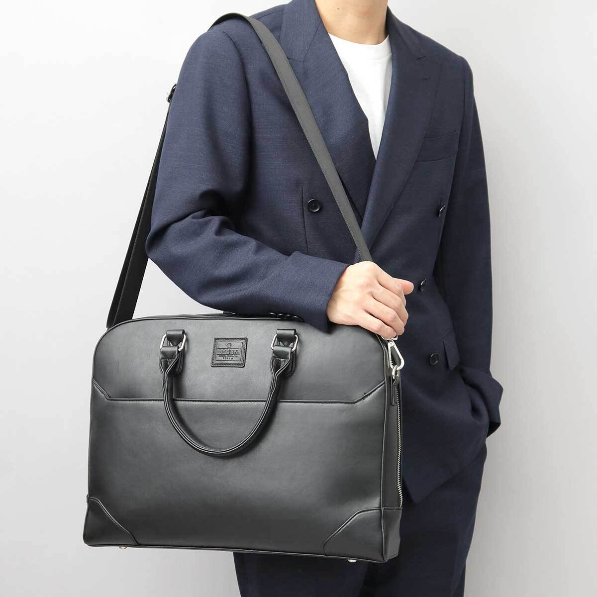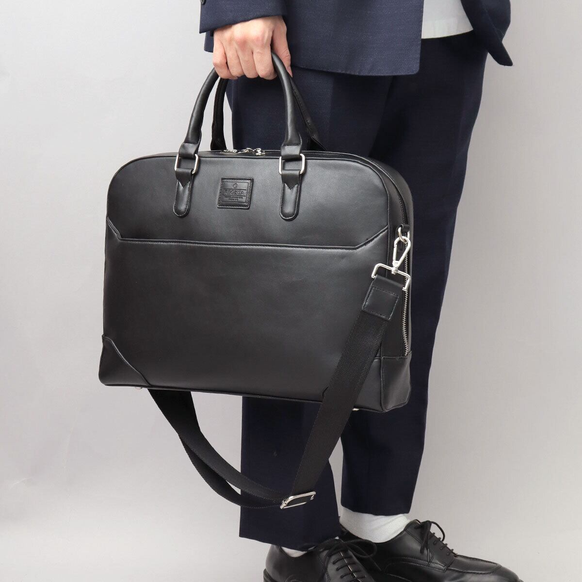 かっちりとしたビジネスシーンはもちろん、オフィスカジュアルやキレイめスタイルにも違和感なく使えるオンオフ兼用のビジネスバッグが登場。大きすぎず、薄すぎない、程よくスリムなコンパクトサイズ。A4サイズの書類やファイルなど、ビジネスマンの必須アイテムがしっかりと収まる大容量。中央に間仕切りを設け、荷物の整理整頓も容易に。ノートパソコンやモバイル端末収納用のクッションポケットに加え、底鋲、付属ショルダーなど、機能性にも細かく配慮。定番デザインながらも適度な光沢のPUレザーを使用し、落ち着いた印象に仕上げました。本革に比べ軽量で撥水性が高く、面倒なお手入れが不要なのもポイント。