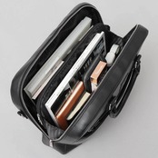 メイン収納は、A4サイズのファイルや書類、ノートパソコン、タブレット端末、財布、手帳、名刺入れなど、ビジネスマンの必須アイテムがしっかり入る大容量。中央に間仕切りを設け、荷物の整理整頓も容易に。