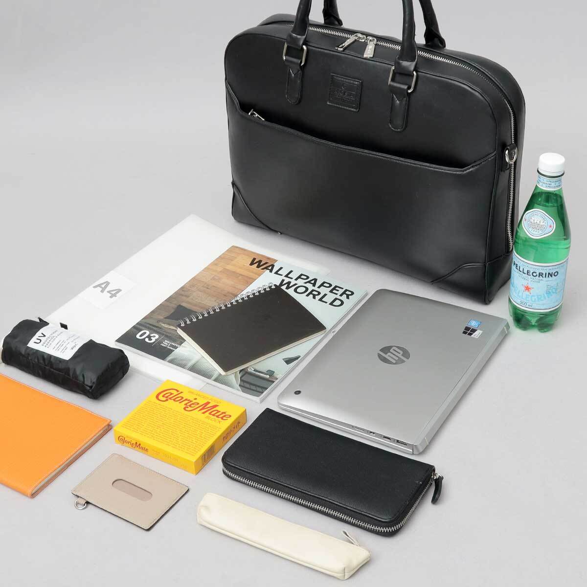 程良くスリムでコンパクトなサイズ感なので、毎日の仕事に重宝します。見た目より軽くてショルダーも付いているので通勤時や出張などの移動時にも使い勝手が良いです。A4収納、PC収納ができるサイズ感や、バッグ自体が自立するのもビジネスシーンでの重要ポイント。シンプルなデザインなので、カジュアルスタイルにはもちろん、スーツやジャケットなどかっちりしたスタイリングにも違和感なく合わせられます。