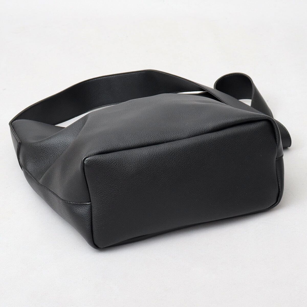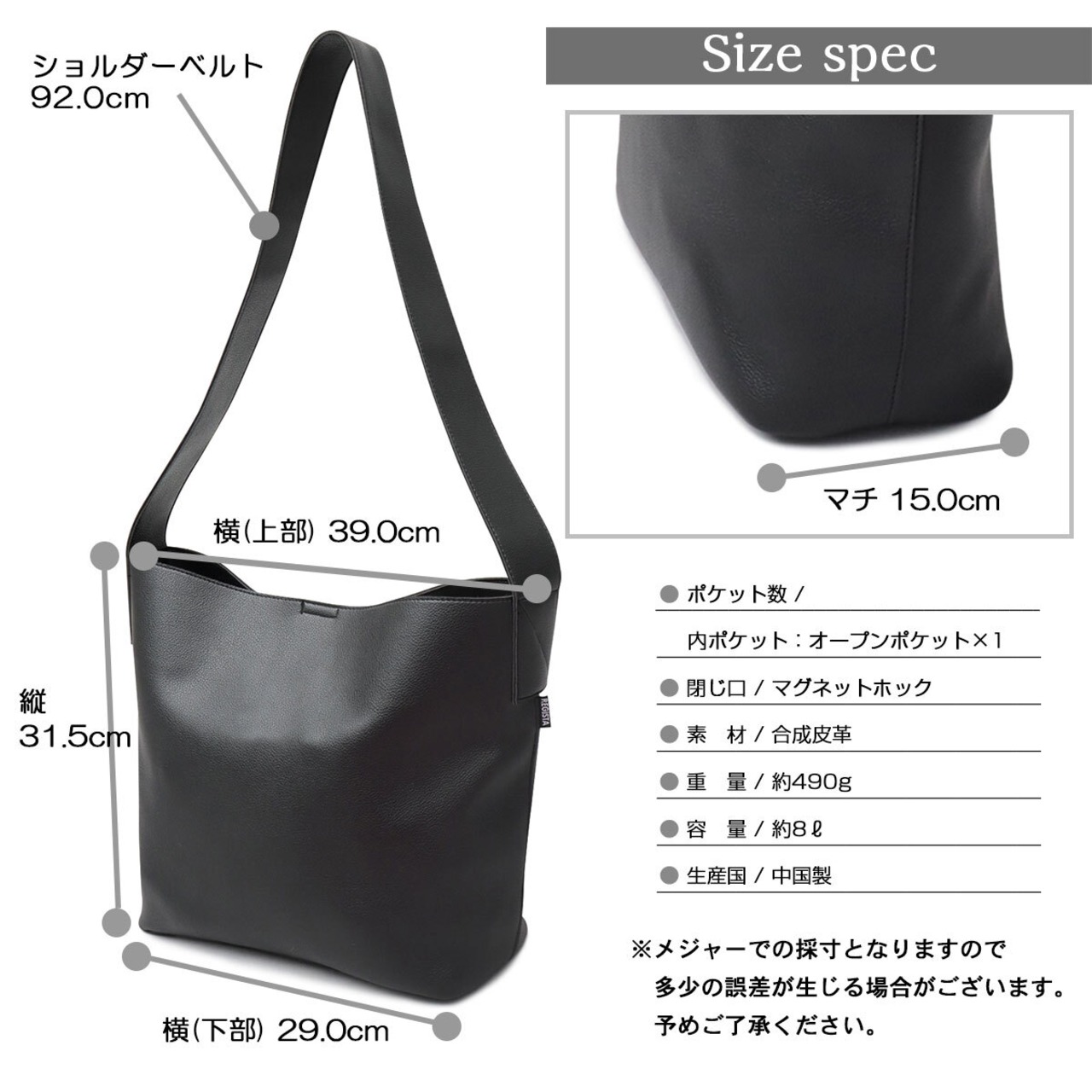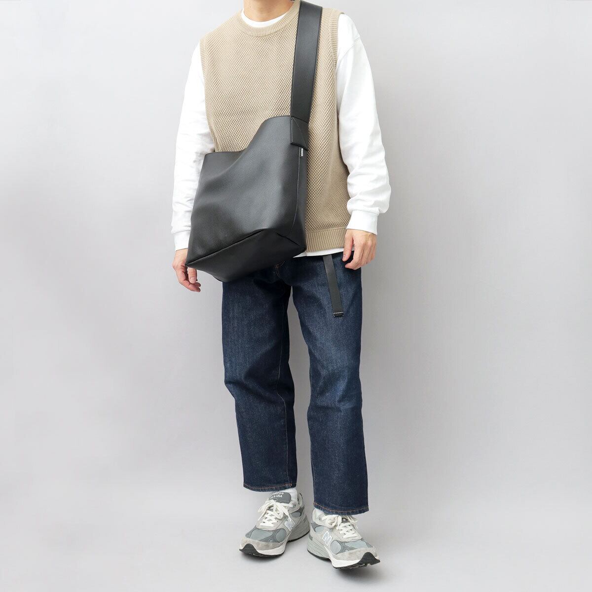 軽量で柔らかなPUレザー1枚で仕立てた、ソフトな作りのワイドショルダーバッグ。落ち着いた雰囲気のシボ素材を使用し、上品で高級感のある表情に仕上げました。カジュアルスタイルやキレイめ、ストリート・モードなど、合わせるスタイリングを選ばず、オンオフ使えるシンプルなデザイン。太めのワイドショルダーは斜めがけでも肩掛けでも使える絶妙な長さで、コーデやシーンに合わせて持ち方を変えて楽しめます。A4ファイルがすっぽり入るサイズ感で、貴重品はもちろん、500mlペットボトルも楽に収まる収納力があり、使い勝手も抜群◎