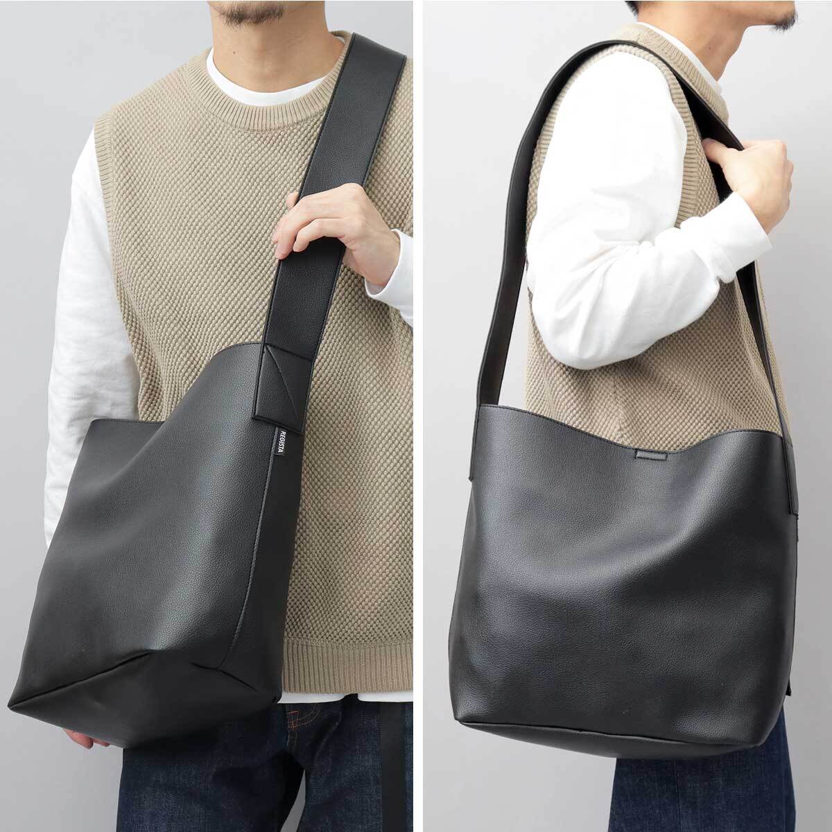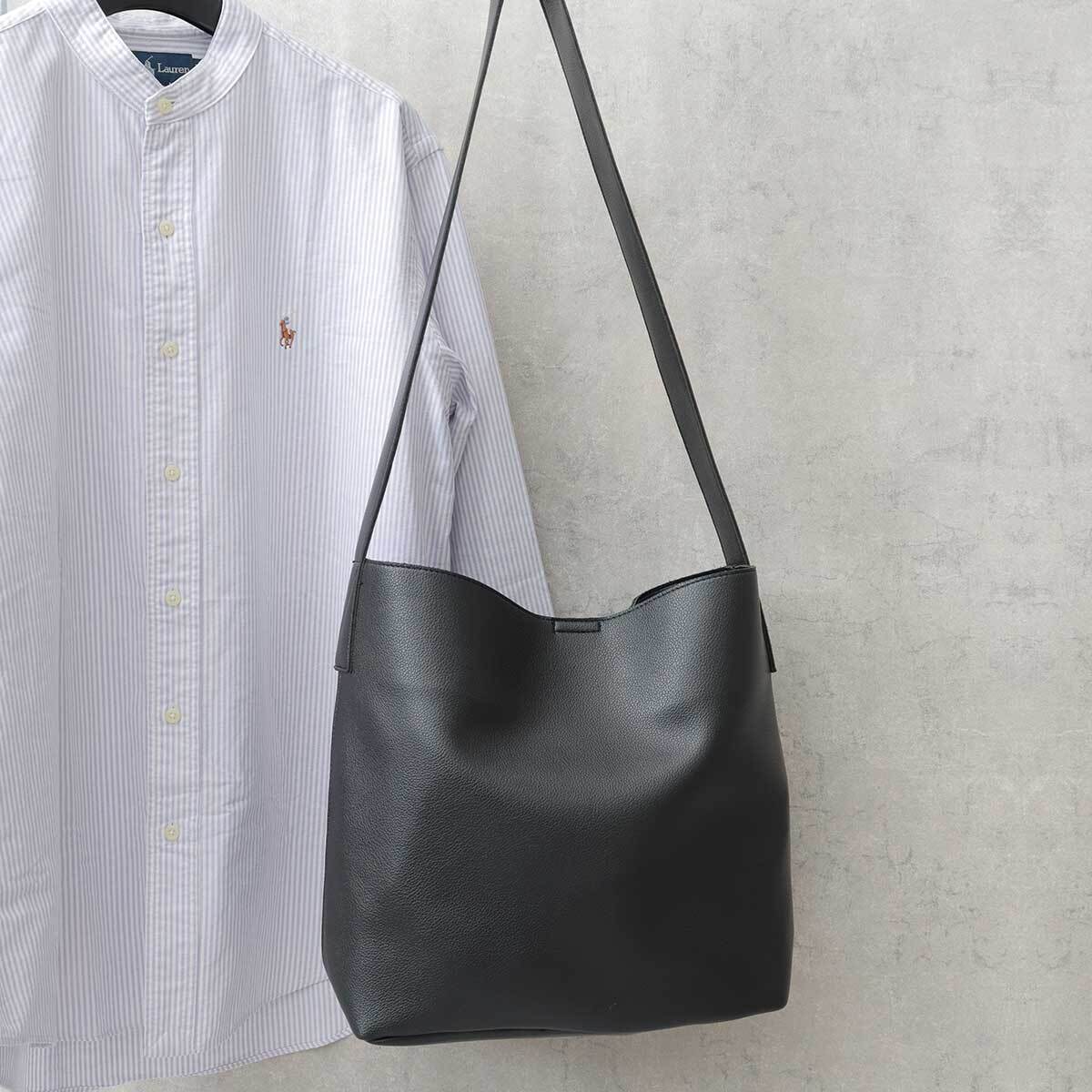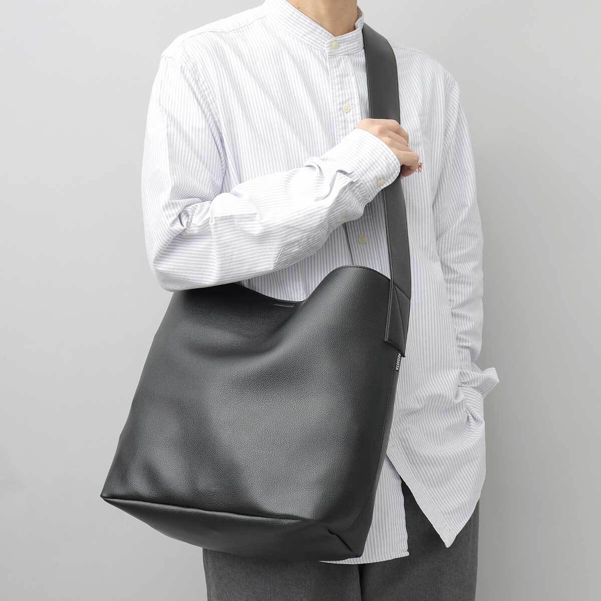 PUレザーの生地1枚仕立ての柔らかな作りなので、軽く、デイリーに使いやすいサイズ感です。ミニマルなデザインなので、カジュアルから大人なスタイリングなど合わせるコーデを問わず使えます。ショルダーが絶妙な長さで、トートバッグのように手持ちや肩掛け、トレンドのニュースペーパーバッグや、たすき掛けバッグのようにスタイルを変えて楽しめます。A4ファイルやノートPCも入るので使い勝手も抜群です。デイリーユースはもちろん、休日のお出かけ・お買い物、旅行など、幅広いシーンで活躍してくれます。
