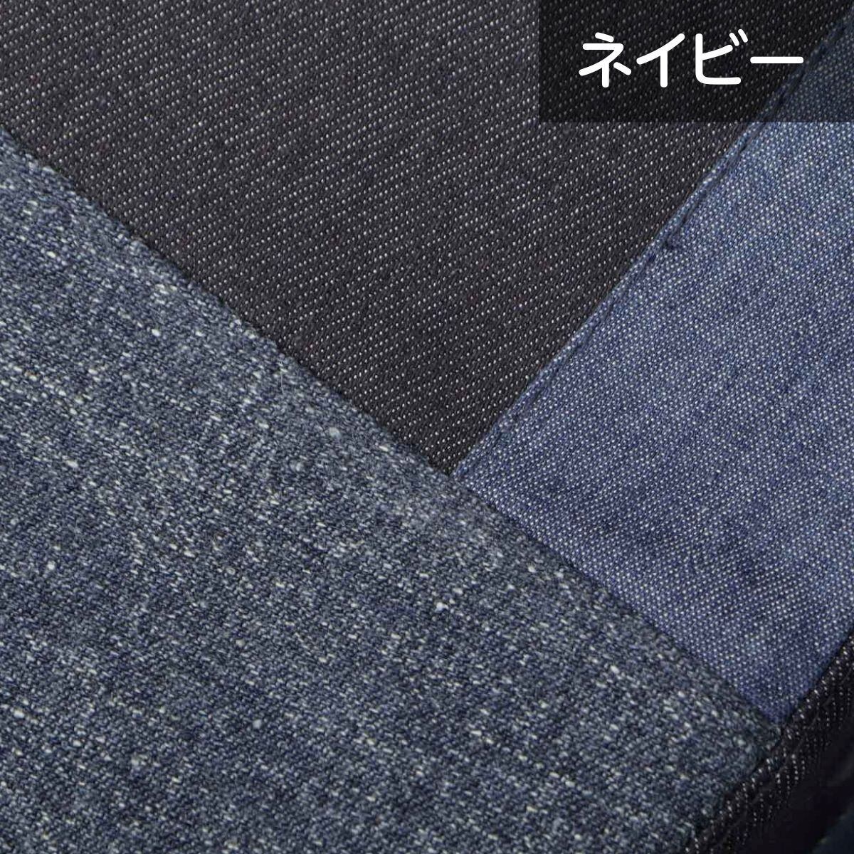 パッチワーク風のボディには、濃淡のあるデニム生地を使用。派手になり過ぎない、同系色のカラーリングもポイント!
