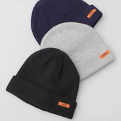 オレンジカラーの小ぶりなピスネームがさり気ないワンポイントになった、シンプルなニットキャップ。