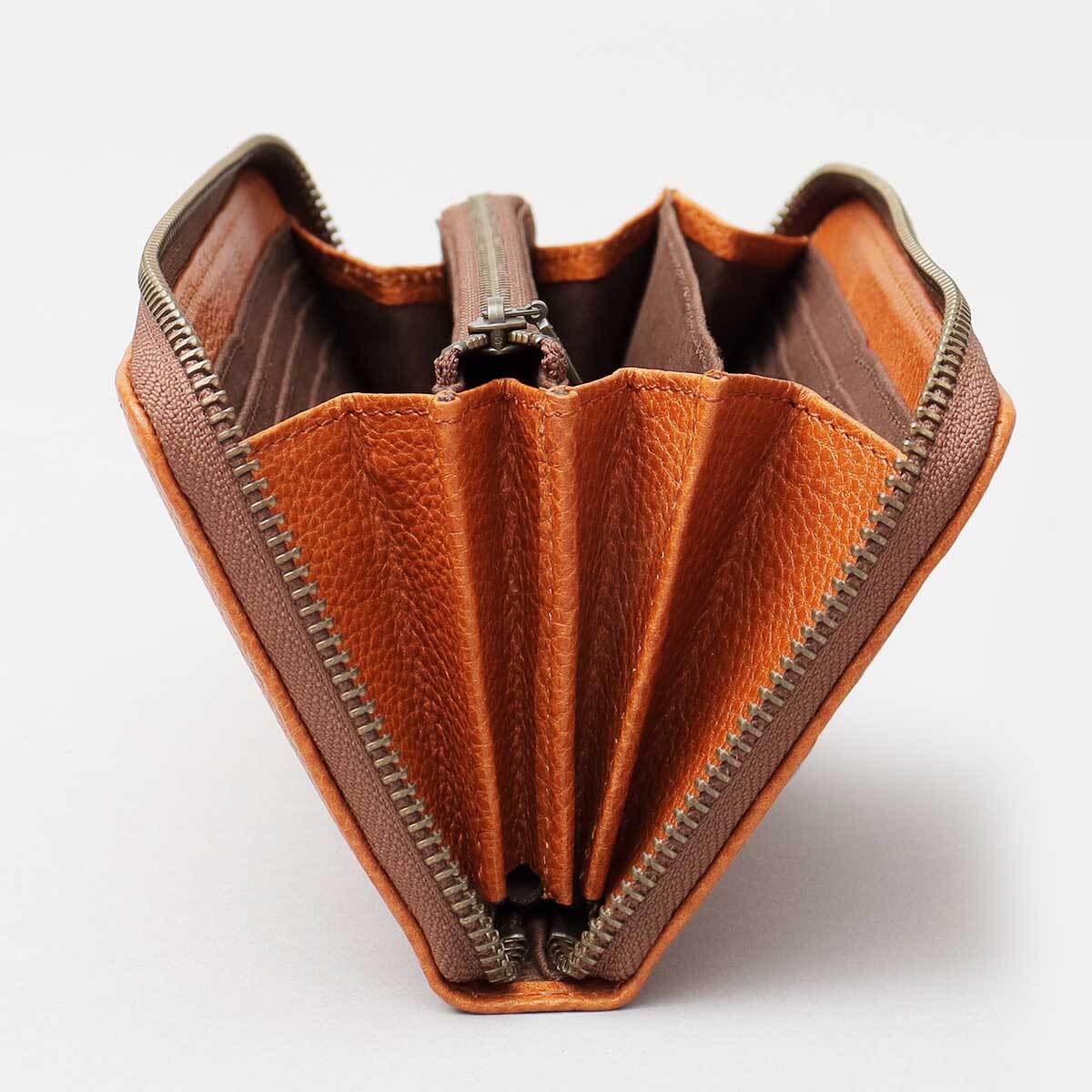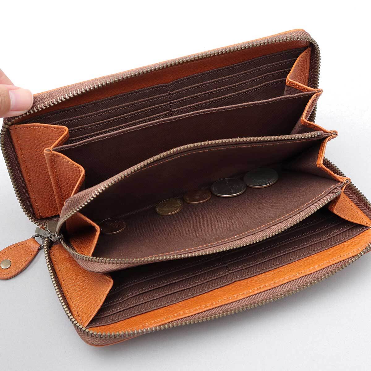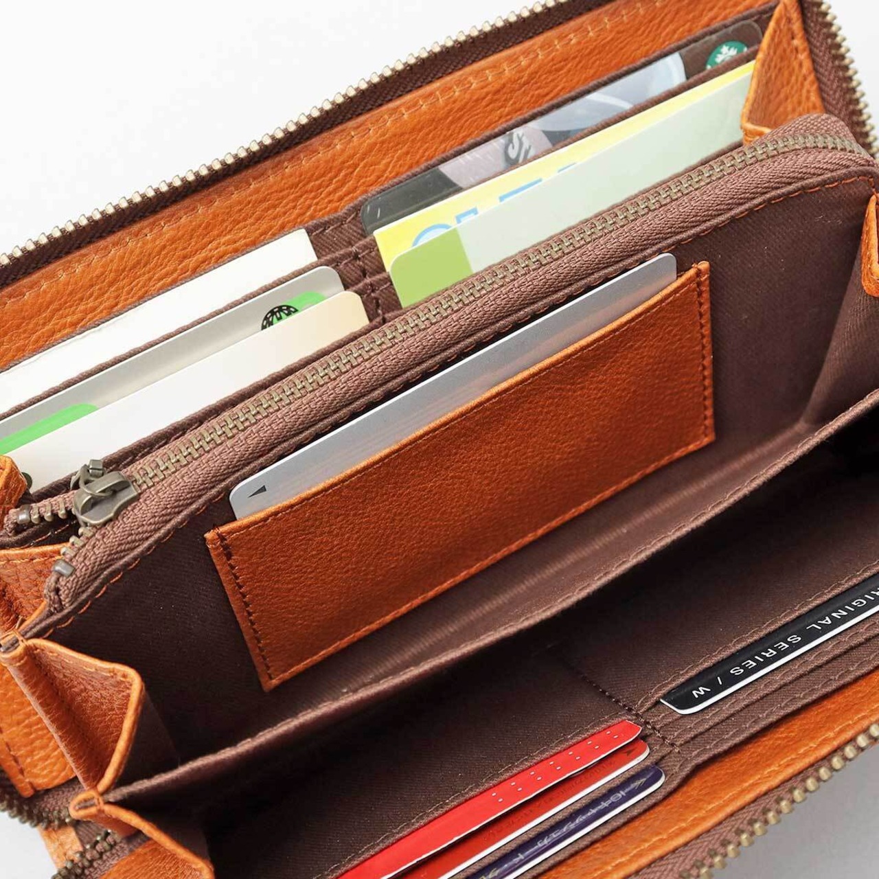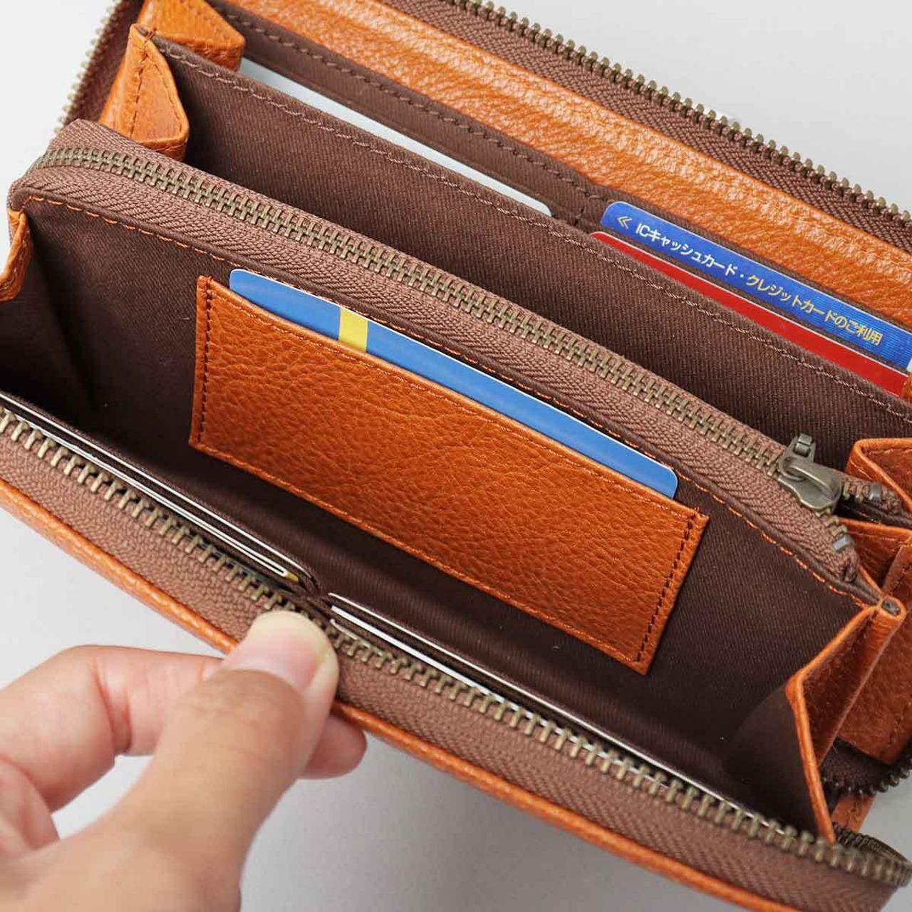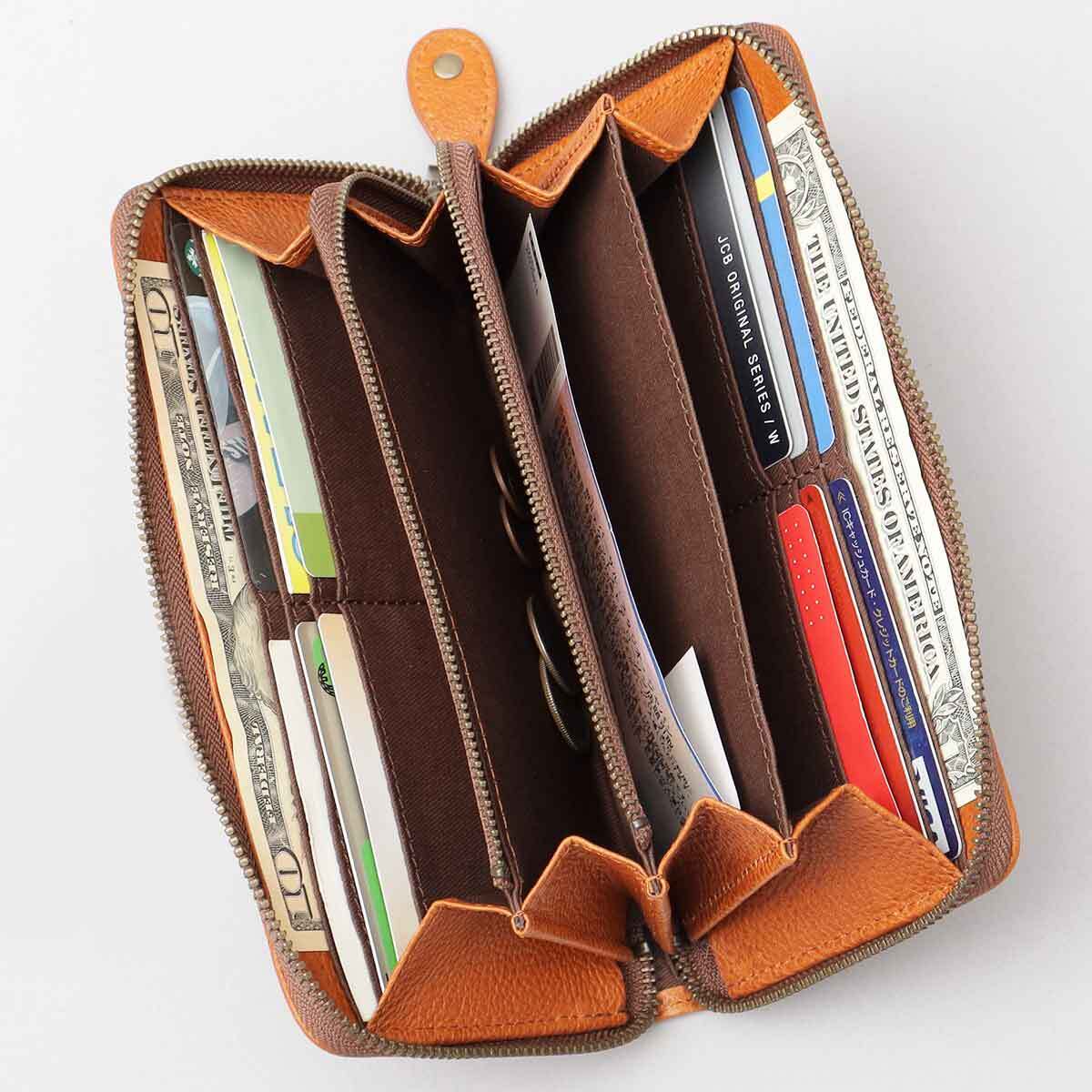 内部には、大きめのフリーポケット×3、カードポケット×14、お札を入れられるロングポケット×2、YKK製ファスナーの小銭入れ×1を完備。小銭入れ部分はL字ファスナー仕様で、間口が大きく開き、中が見やすく、小銭の出し入れが楽に◎