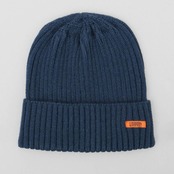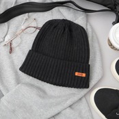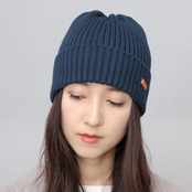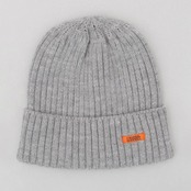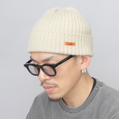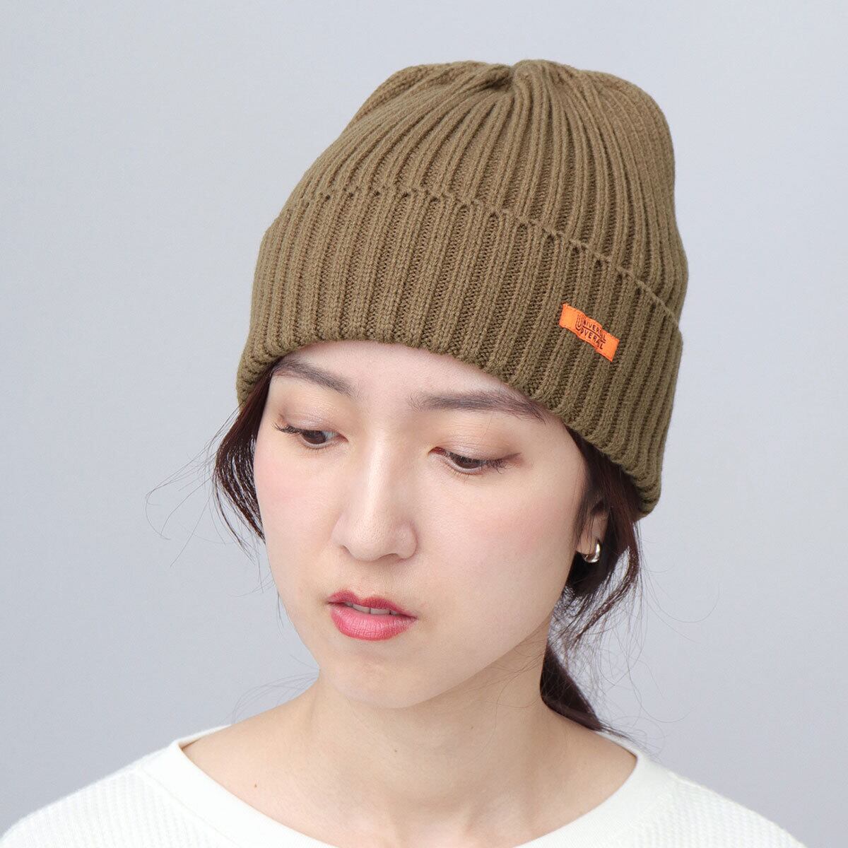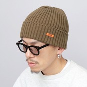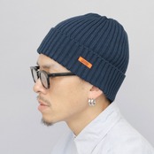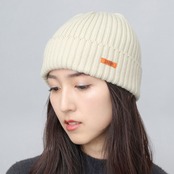優しい凹凸感のあるリブニット生地に、オレンジカラーの小ぶりなピスネームがさり気ないワンポイントになった、シンプルなニットキャップ。