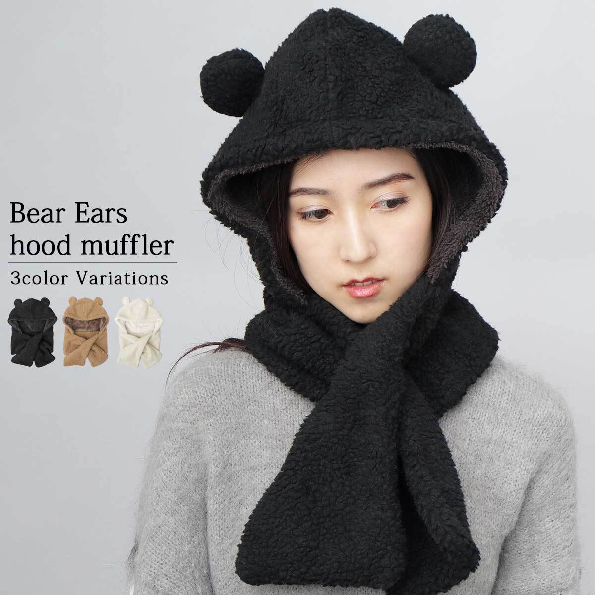 HDT-177 フードマフラー 耳付き マフラー レディース シープボア 差し込みマフラー フード付マフラー くま耳 ベアイヤー ネックウォーマー 差込み 耳付きマフラー 冬 防寒 首元 暖かい かわいい もこもこ | A.M.S.