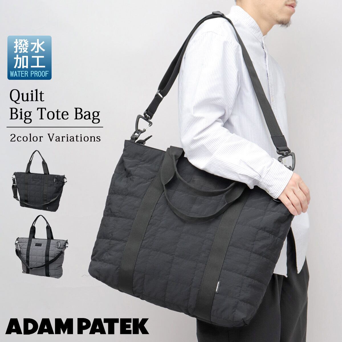 SRU-009 トートバッグ ショルダートート メンズ 2WAY ショルダーバッグ トート バッグ 撥水加工 はっ水 大容量 大きめ A4 ナイロン キルト 手持ち 斜めがけ 黒 ブラック PC収納対応 アダムパテック ADAM PATEK